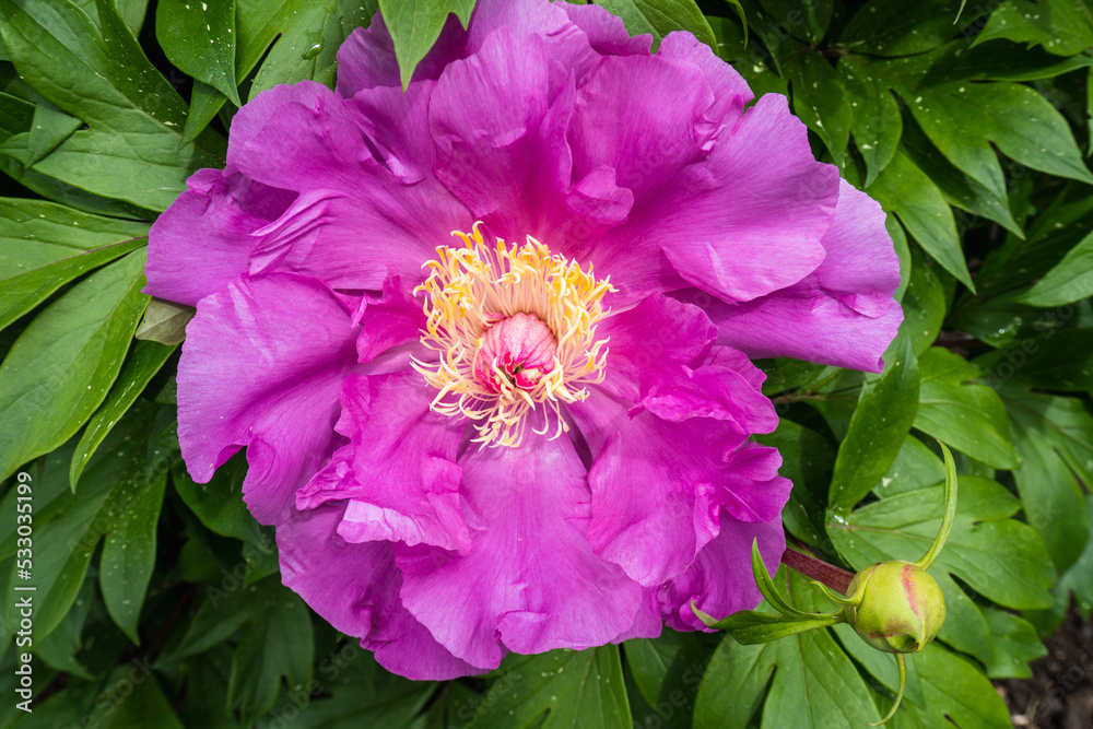 Peony 'Gordon E. Simonson' (Paeonia, Paeoniaceae, Itoh) Midseason semi-double fuchsia pink Peony Itoh hybrid, brilliant fuchsia pink with pale creamy stamens and wavy petals.