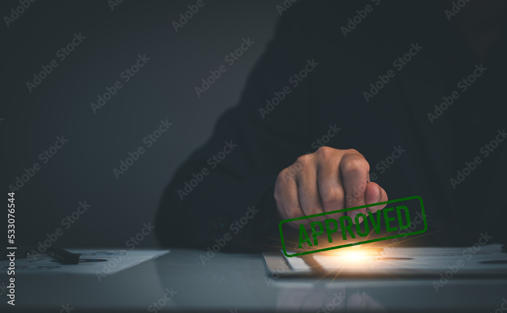 Business approved concept. Manager hand stamping with approved stamp on certificate document public paper, investment certificate, business document, certificate approved, investment allowed.