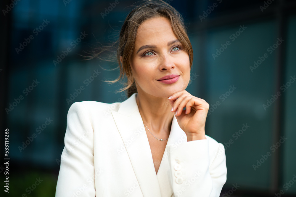 Confident young female manager outdoor in a modern urban setting in a pensive expression