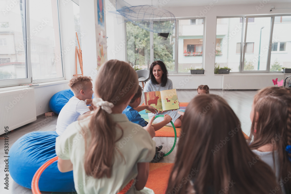Reading time in an elementary school or kindergarten, a teacher reads a book to children in an elementary school or kindergarten. The concept of pre-school education. Selective focus