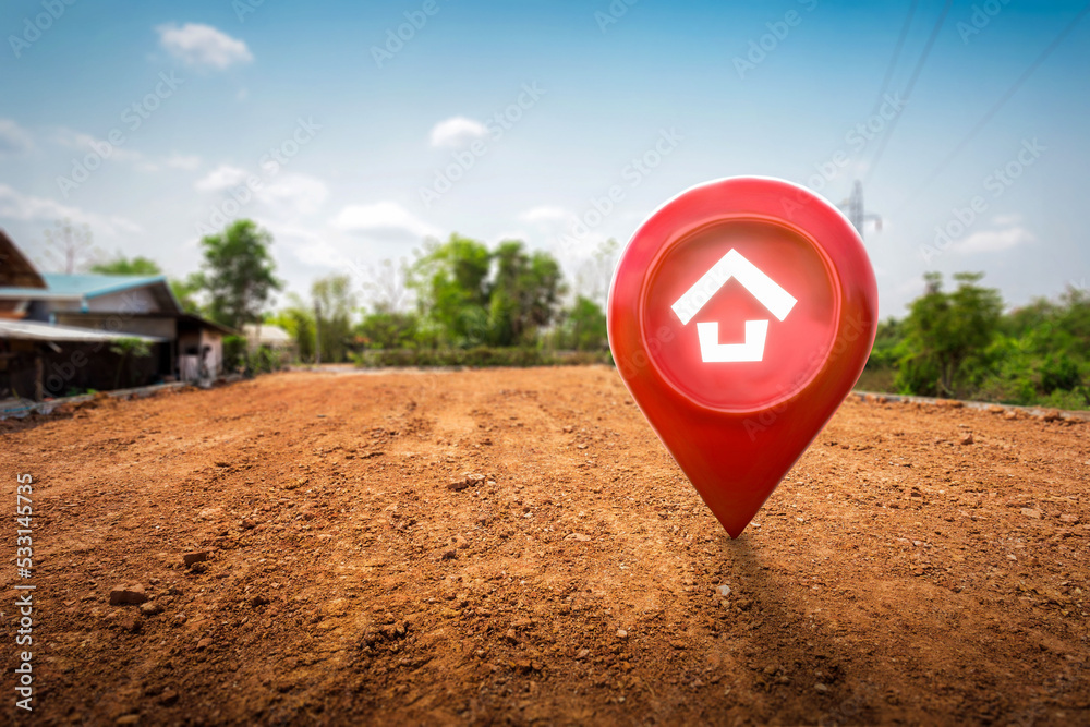 House symbol with location pin icon on empty dry cracked swamp reclamation soil in real estate sale or property investment concept, Buying new home for family - 3d illustration of big advertising sign