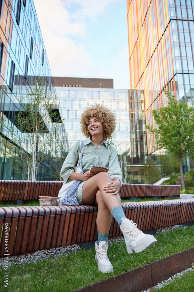 Full length shot of beautiful curly female student poses on wooden bench in urban park during daytime holds spiral notebook with pen for writing down notes looks gladfully aside studies outdoors