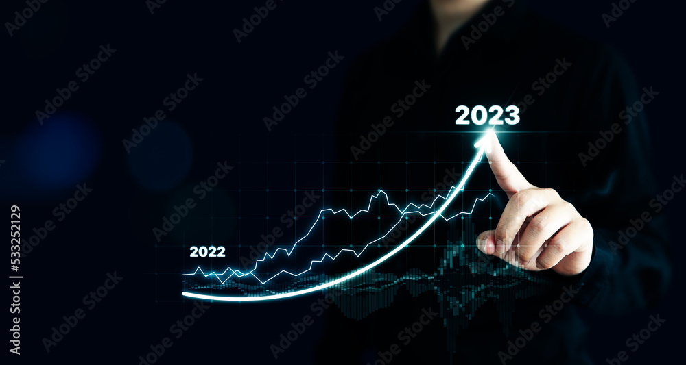 Businessman pointing arrow graph corporate future growth plan. Business development to success and growing growth year 2022 to 2023 concept