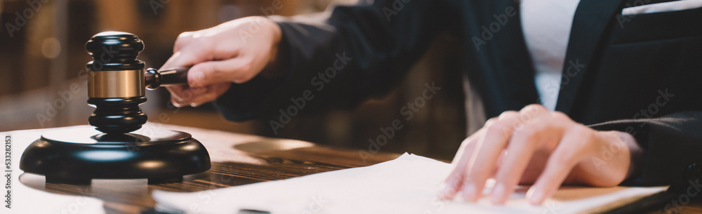 Banner background of A picture of a hand hitting a hammer. The gavel blow of a judge or decision-maker to authority about business, justice, or the law for a court proceeding.