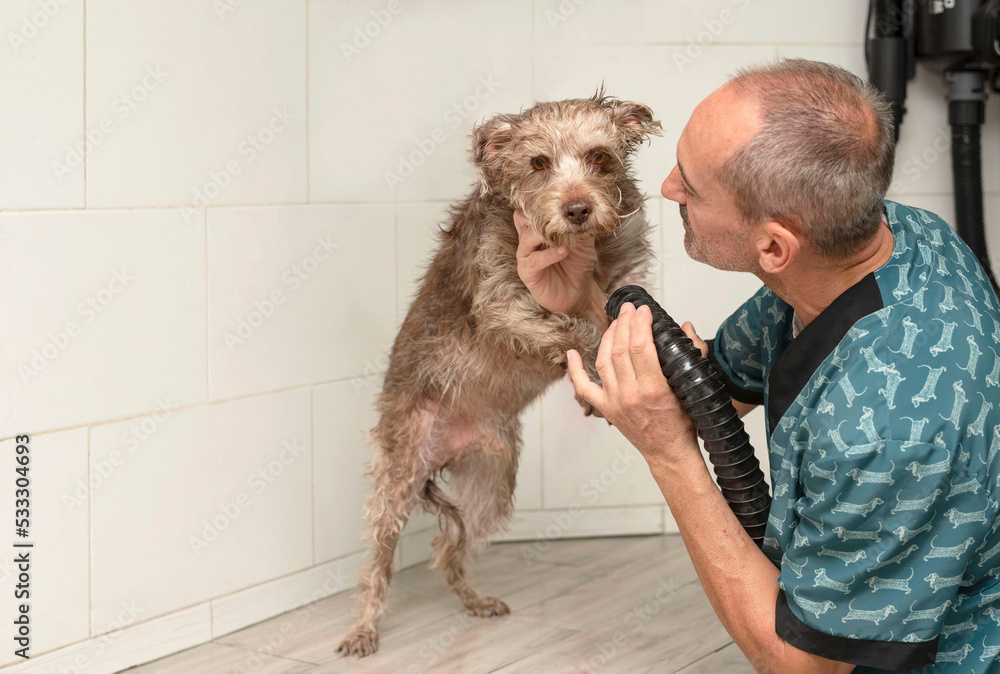 professional man drying wet dog, in the grooming salon. Making beautiful view of pet hair