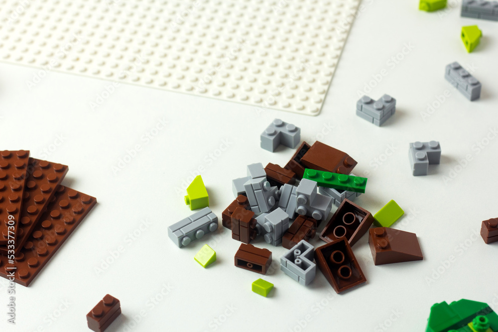 building with plastic brick. Construction blocks. Miniature collection. Family activity and hobby