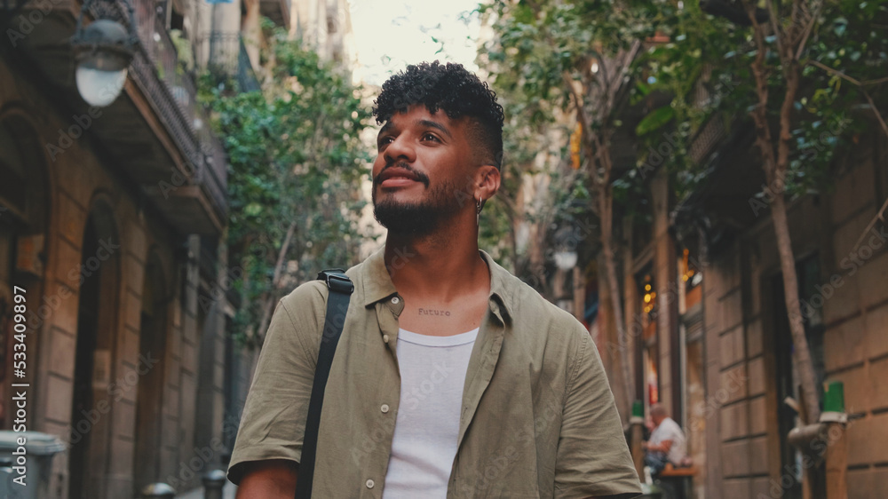 Close up, young smiling man dressed in an olive-colored shirt walks along the narrow street of the old city and looks around