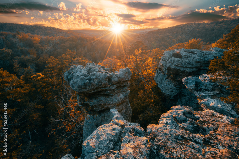 Arkansas Pedestal Rocks overlooking the Ozark Mountains in Autumn during a colorful sunset in the St. Francis forest.