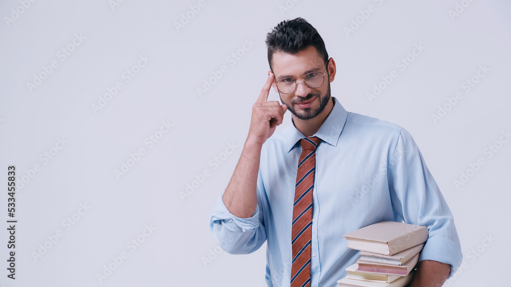 smiling teacher holding pile of books and pointing at head isolated on grey.