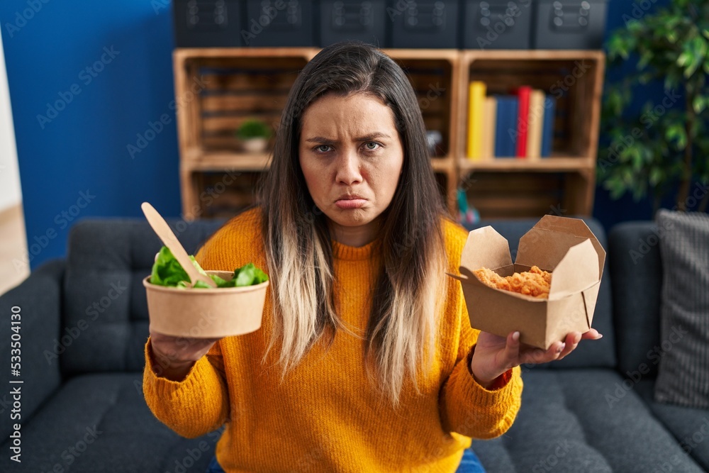 Young hispanic woman holding healthy salad and fried chicken wings depressed and worry for distress, crying angry and afraid. sad expression.