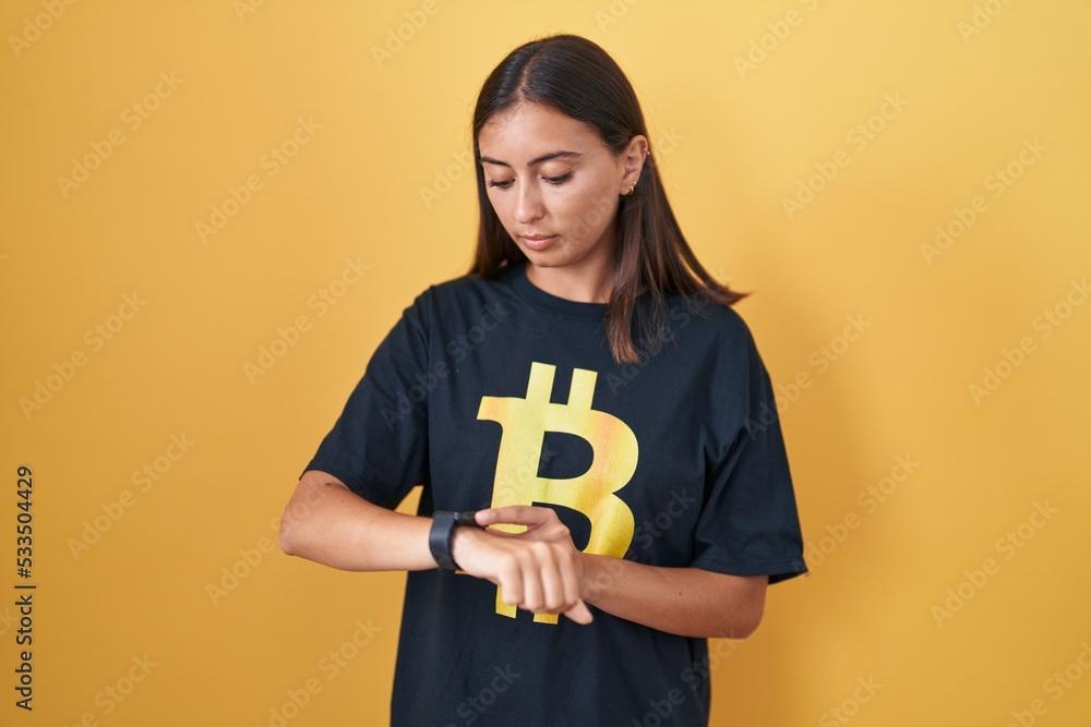 Young hispanic woman wearing bitcoin t shirt checking the time on wrist watch, relaxed and confident
