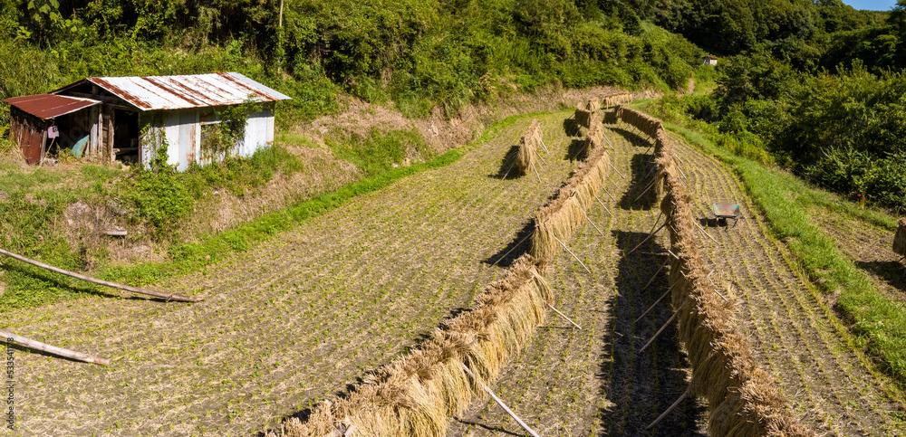 Rustic shed and freshly harvested rice in sunshine on traditional farm
