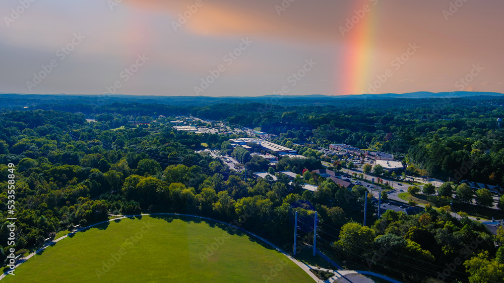 an aerial shot of the vast miles of lush green trees and grass with buildings nestled among the trees and powerful clouds and a rainbow at Etowah River Park in Canton Georgia USA