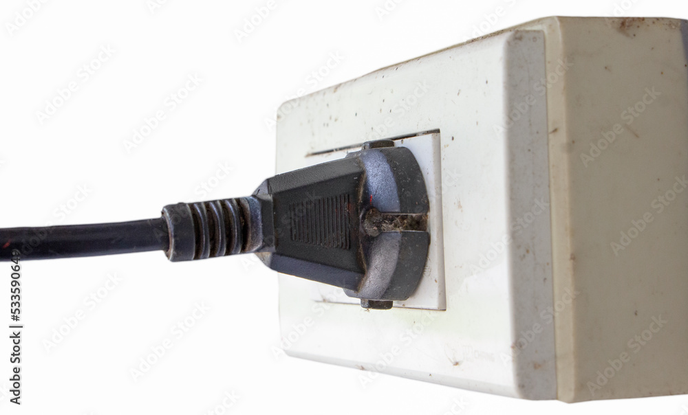 Black plug connected to the wall socket, line is stretched to the left side. Isolated white background.