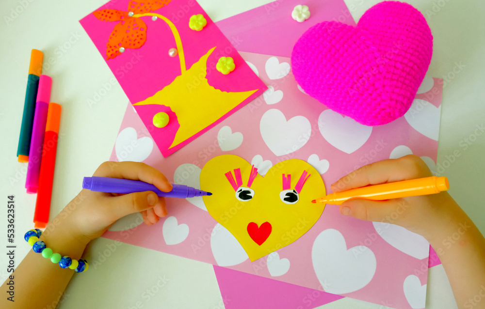 Child preparing for Mothers Day, making greeting card. Girl making paper sun and fabric crochet heart as gifts for Mothers day, Birthday or Valentines day. Ambidexter draws with both hands