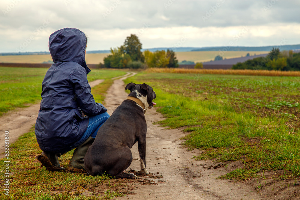 A woman walks her dog in a field after a thunderstorm. Girl with staffordshire terrier in nature on a cloudy day. The concept of freedom, happiness, friendship, nature.