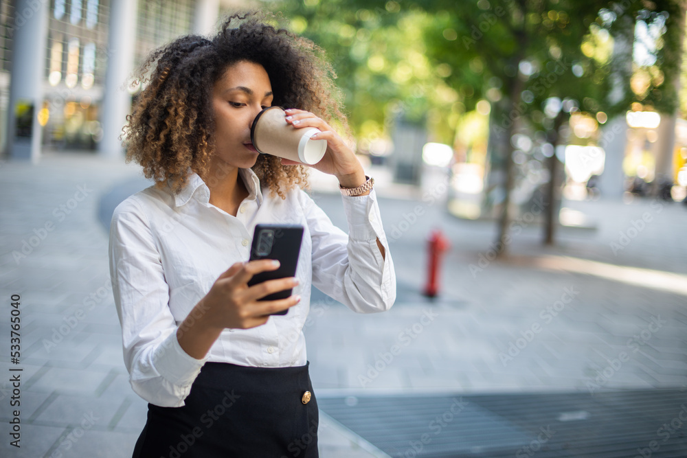 Black business woman using her mobile phone in a business environment