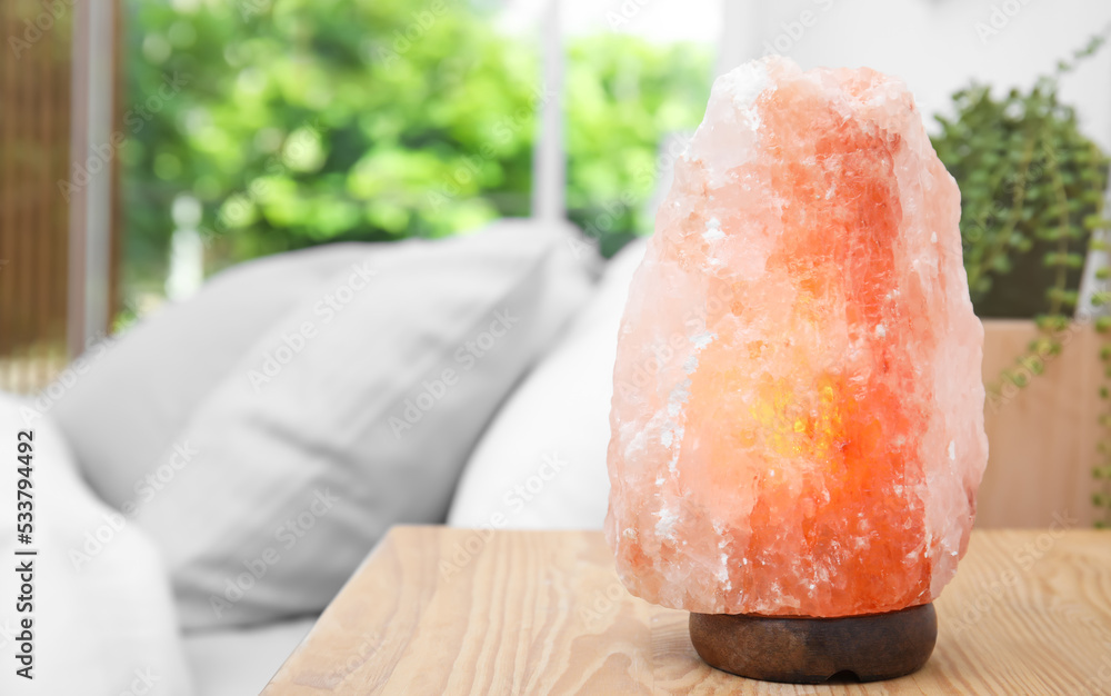 Himalayan salt lamp on wooden table in bedroom. Space for text