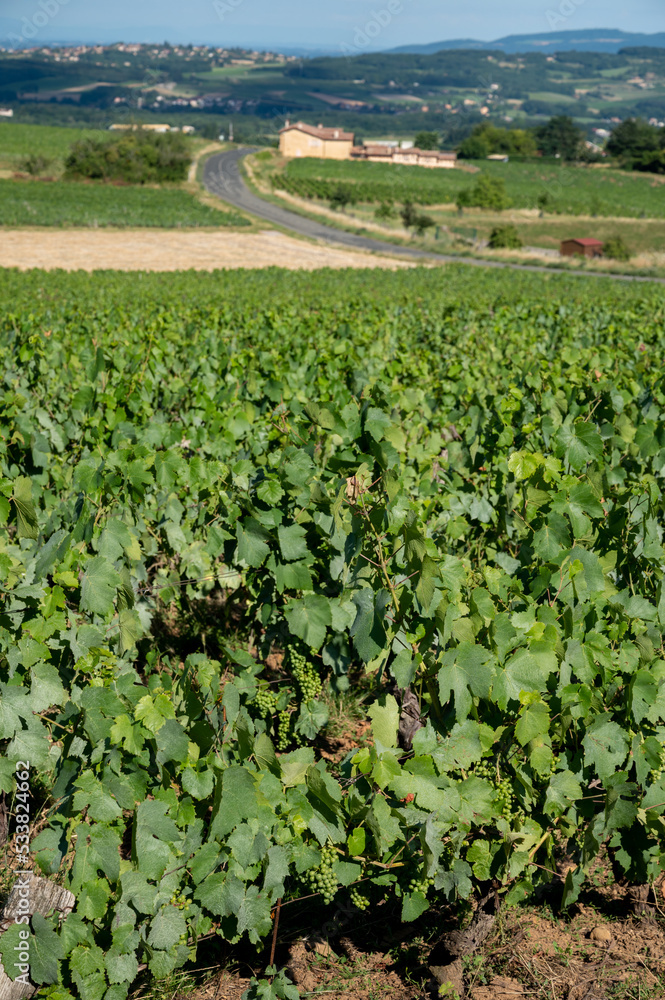 Landscape with vineyards near beaujolais wine making village Val d'Oingt, gateway to Beaujolais Wine Route and hilly landscapes of the Pierres Dorées, France
