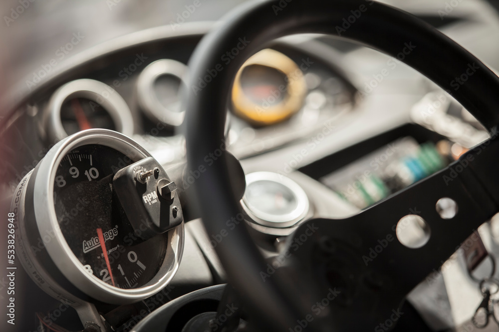Rally car dashboard gauges and steering wheel close up macro, switches