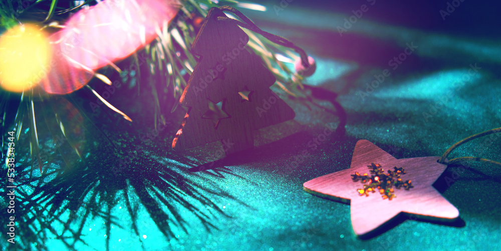 New Year decorations. Wooden Christmas tree toy, natural branches of pine and blinking lights. Festively decorated Christmas tree branches. Softness and blurred