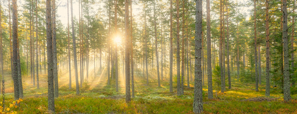 Sunbeams shining through natural forest of pine trees