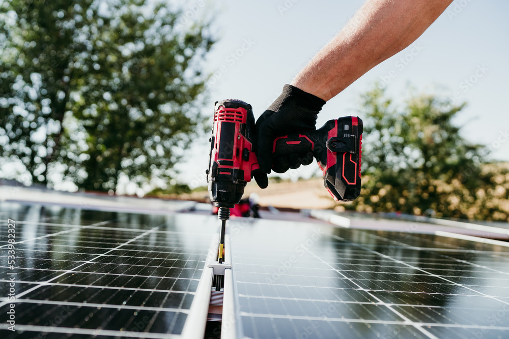 close up hand of mature Technician man assembling solar panels with drill on house roof for self consumption energy. Renewable energies and green energy concept
