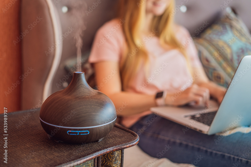 A woman sits on a bed and works on a laptop. Aroma diffuser next to the bed