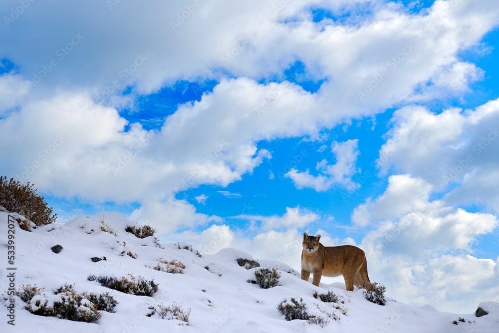 Puma, nature winter habitat with snow, Torres del Paine, Chile. Wild big cat Cougar, Puma concolor, hidden portrait of dangerous animal with stone. Mountain Lion. Wildlife scene from nature.