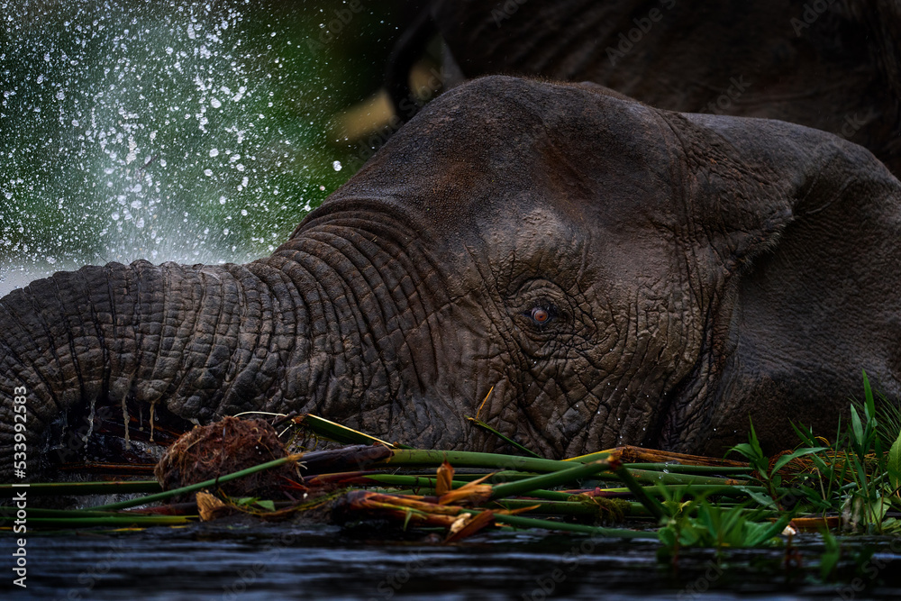 Uganda wildlife, Africa. Elephant in rain, Victoria Nile delta. Elephant in Murchison Falls NP, Uganda. Big Mammal in the green grass, forest vegetation. Elephant watewr walk in the nature habitat.