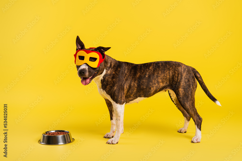 purebred staffordshire bull terrier in superhero mask standing near bowl with pet food on yellow.