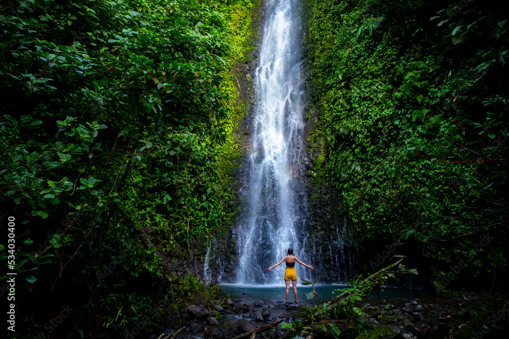 brave girl stands in front of a mighty waterfall with her hands raised in the air; celebration of a successful climb over a waterfall; tropical waterfall in Costa Rica; hidden gems of costa rica
