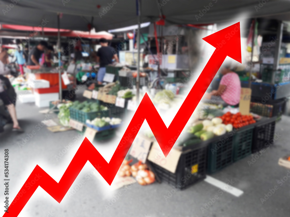 Big red arrow growing on abstract blurred image of supermarket background. Bar charts and charts. Food prices rose. Inflation concept. retail. Finance and Economics. stock market. shop.