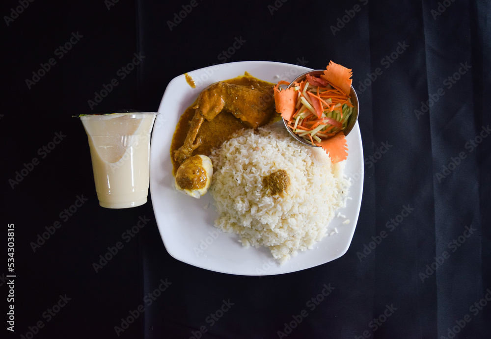 Polao and Roast. Tasty Indian Pulao with Chicken Roast. Biriyani with chicken curry on white plate.