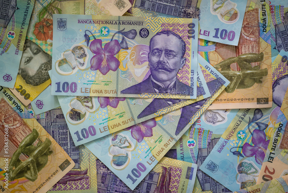American cash, UK pound, Euro, ron lei romanian banknotes money dollar bills UK pound background financial concept cash close-up.