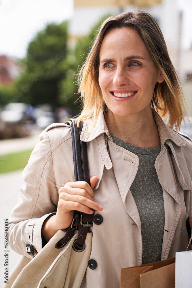 Mid-shot of smiling woman holding her handbag while walking in the street