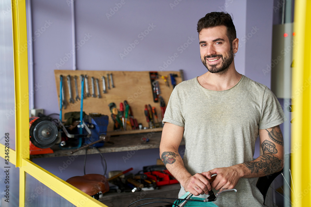 Medium-shot of smiling bearded mechanic standing in his workshop in front of his tools