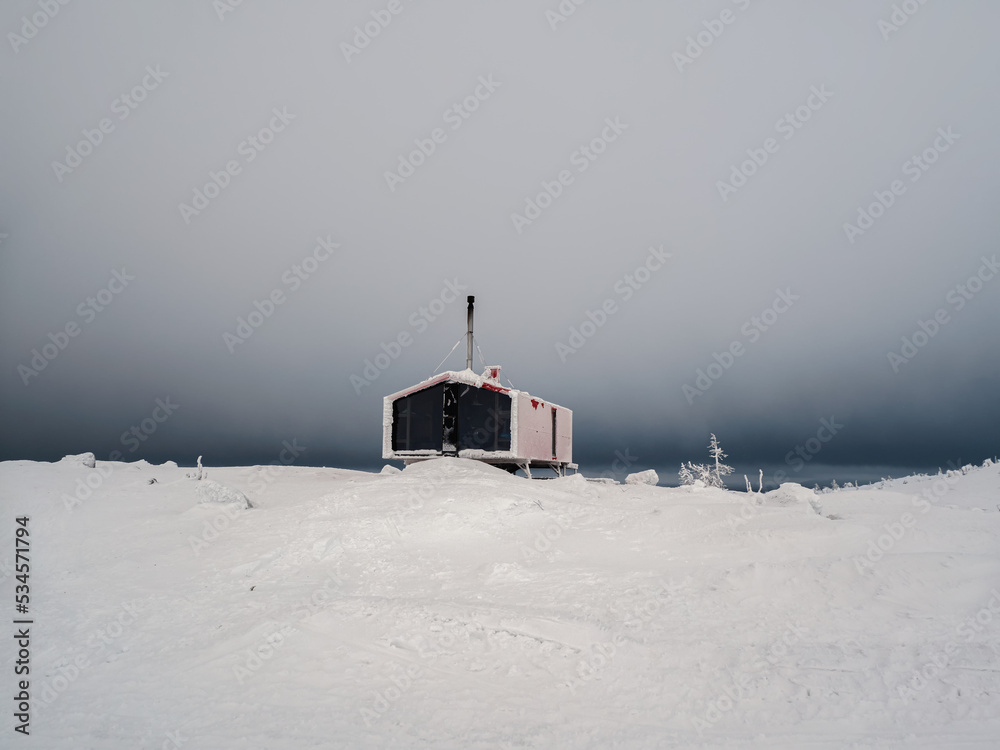 Lonely red guest house on a snow-covered slope in winter under night dramatic sky. Winter shelter for tourists, house on the mountain.