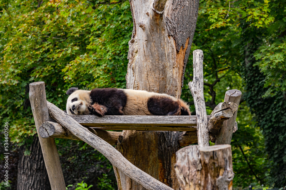A giant panda sleeps in the tree house in the zoological garden in Berlin