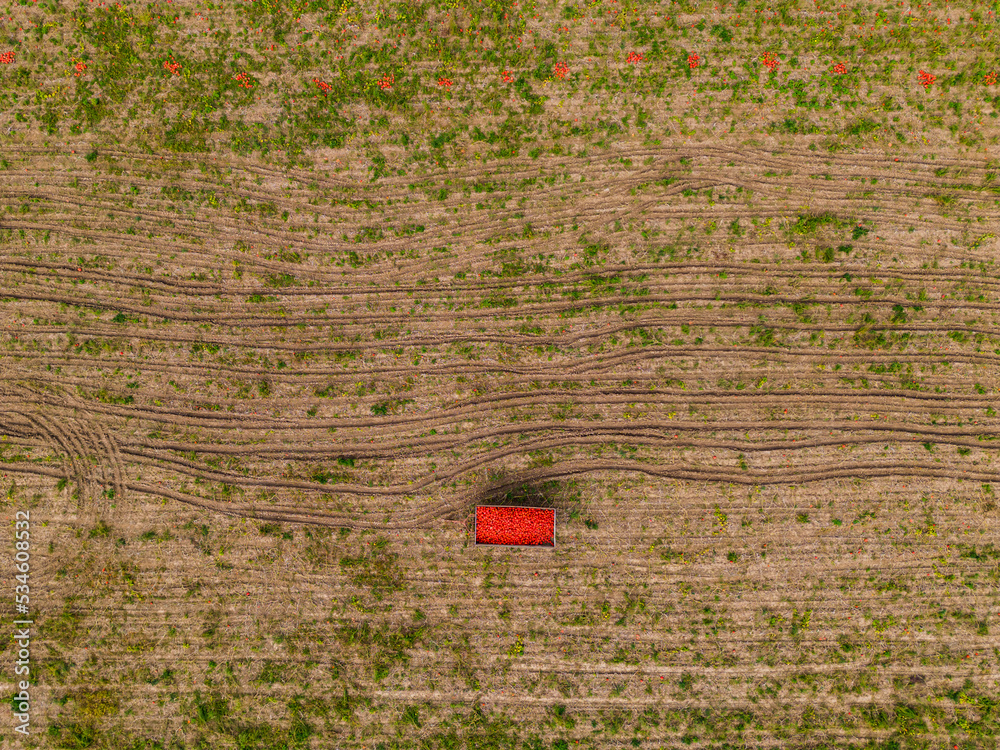 A trailer full of Hokkaido pumpkins seen from high above from drone perspective