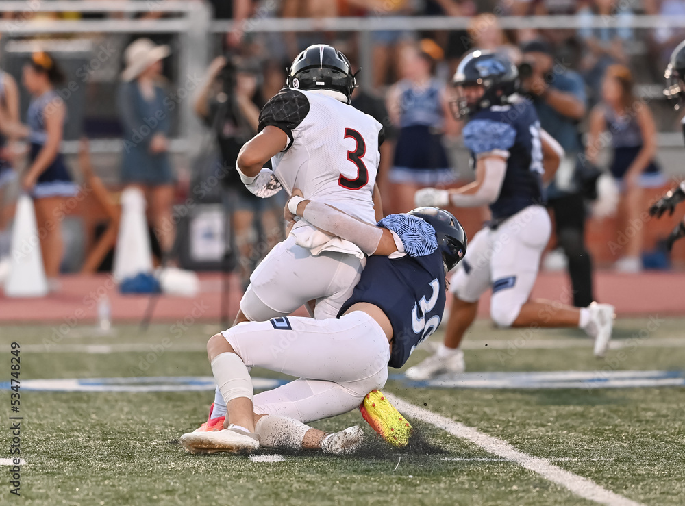 Young athletic tackle football players making great plays during a game