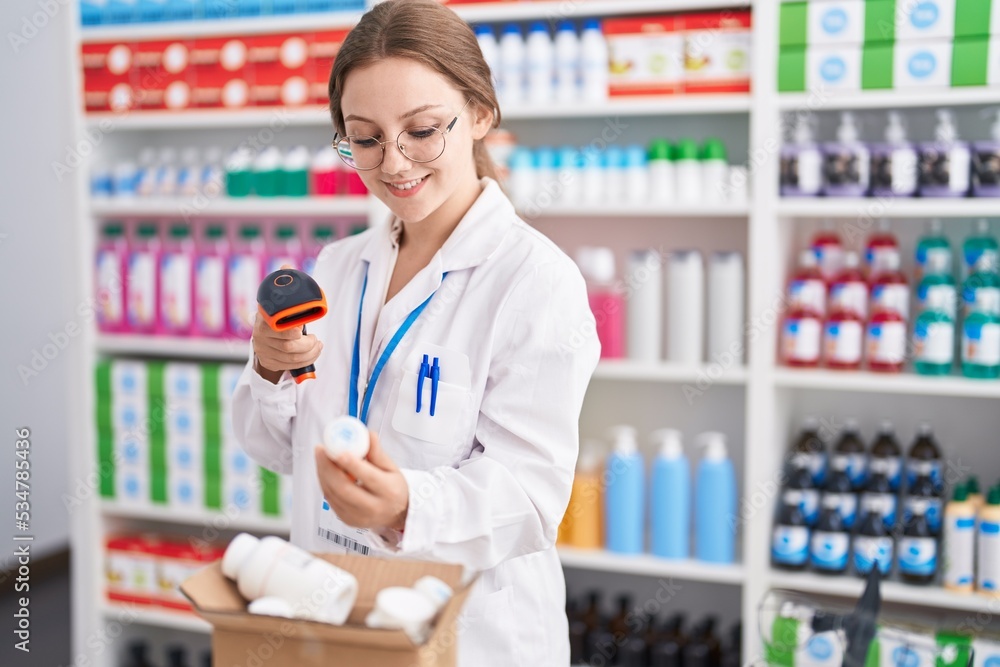 Young blonde woman pharmacist scanning pills bottle at pharmacy