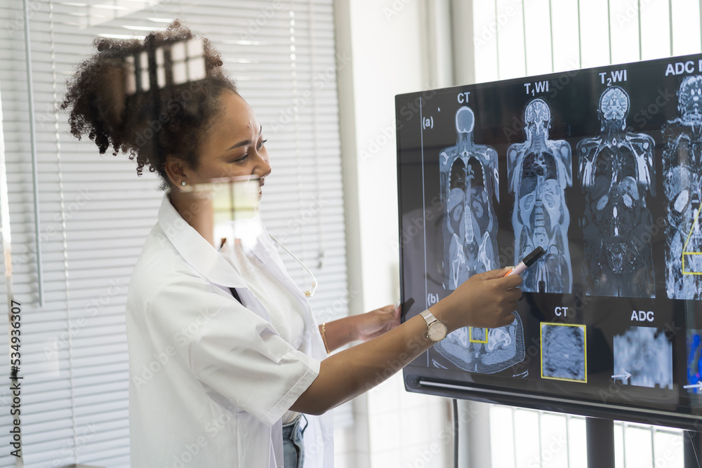 Female doctor presenting x-ray film anatomy and physiology human of patient on digital monitor