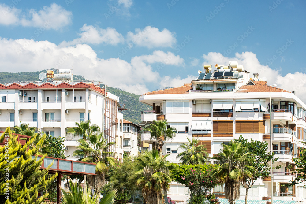 Residential real estate in Turkey. Apartment houses in Alanya, Turkey. Buy, rent houses concept.