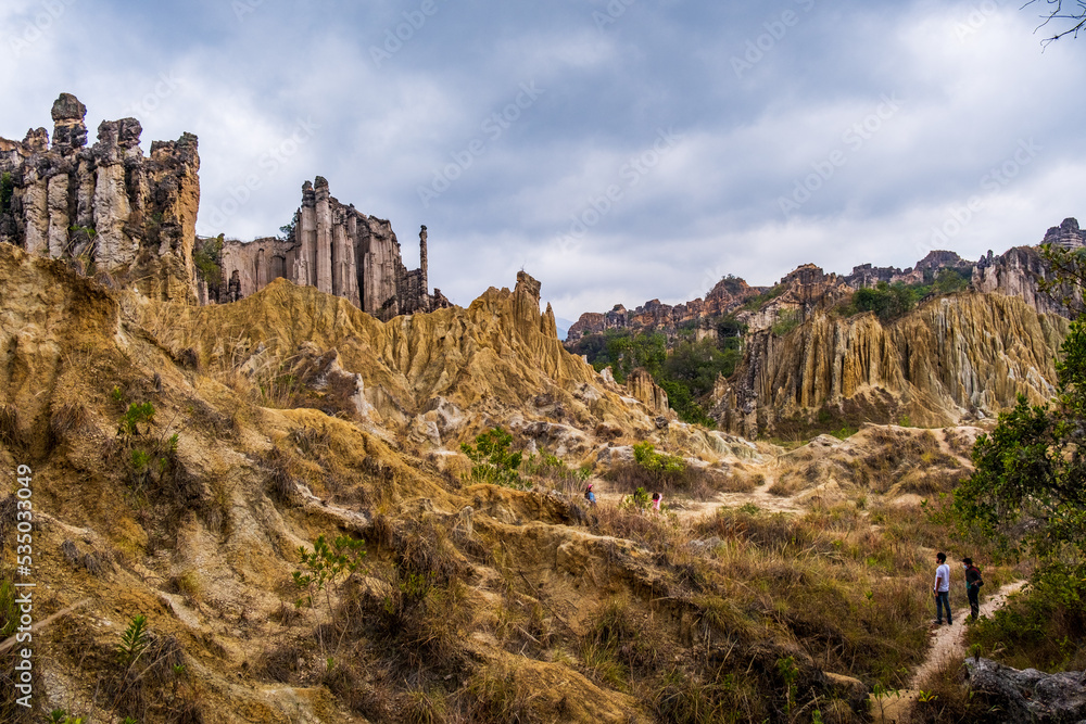 Los Estoraques Unique Natural Area, national park in the Cordillera Oriental of Colombia, Norte de Santander Department. Large brownstone pedestals and columns formed by erosion. Travel destination