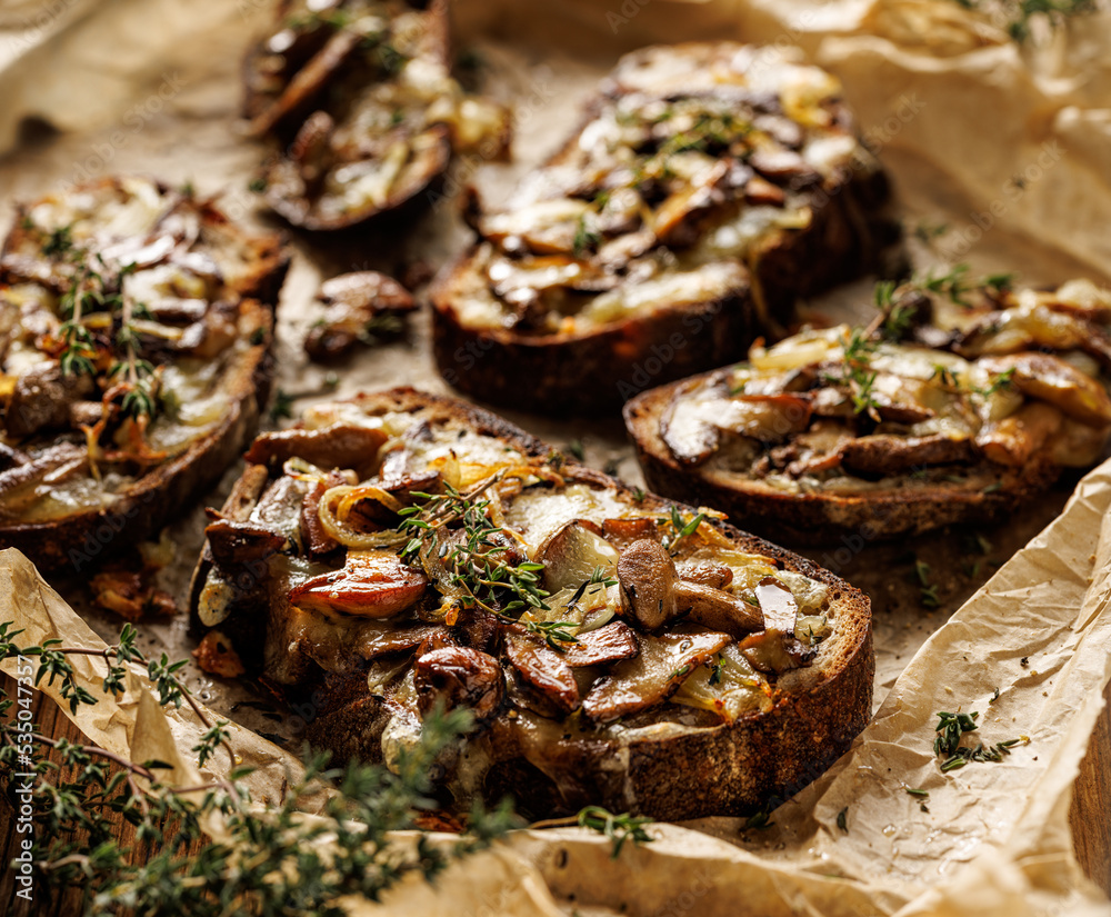 Grilled sandwiches with mushrooms, mozzarella cheese and thyme, focus on the sandwich inside