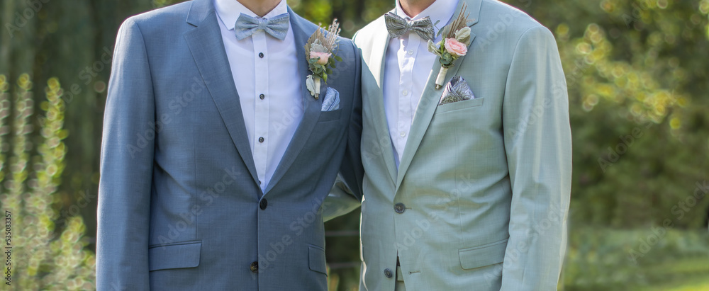 Panorama von homosexuelles Ehepaar am Hochzeitstag in der natur