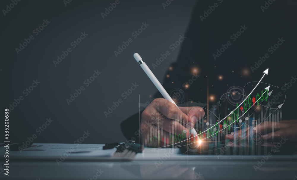 Digital marketing concept. Business man analyzing internet marketing online, business planning, online digital business, online stock market analysis, stock chart upward trend, digital stock trading.