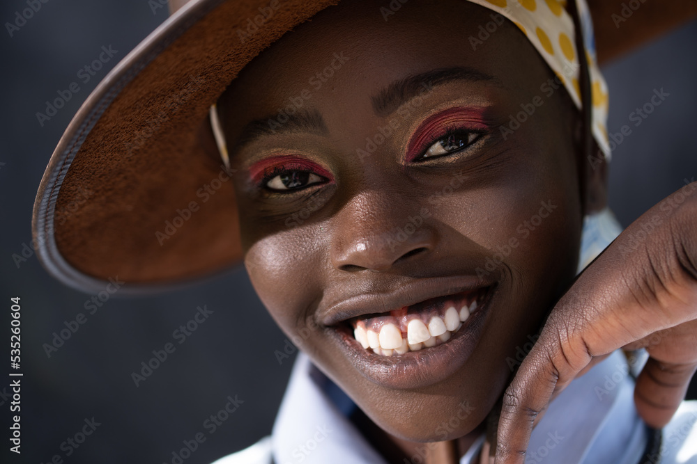 African girl laughing. Authentic smile. Girl with a cowboy hat.
