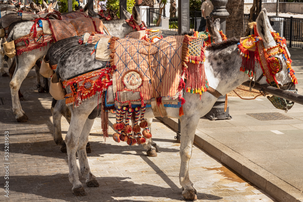 Traditional donkey taxi in the famous white spanish mountain village of Mijas in Andalusia; Costa del Sol.